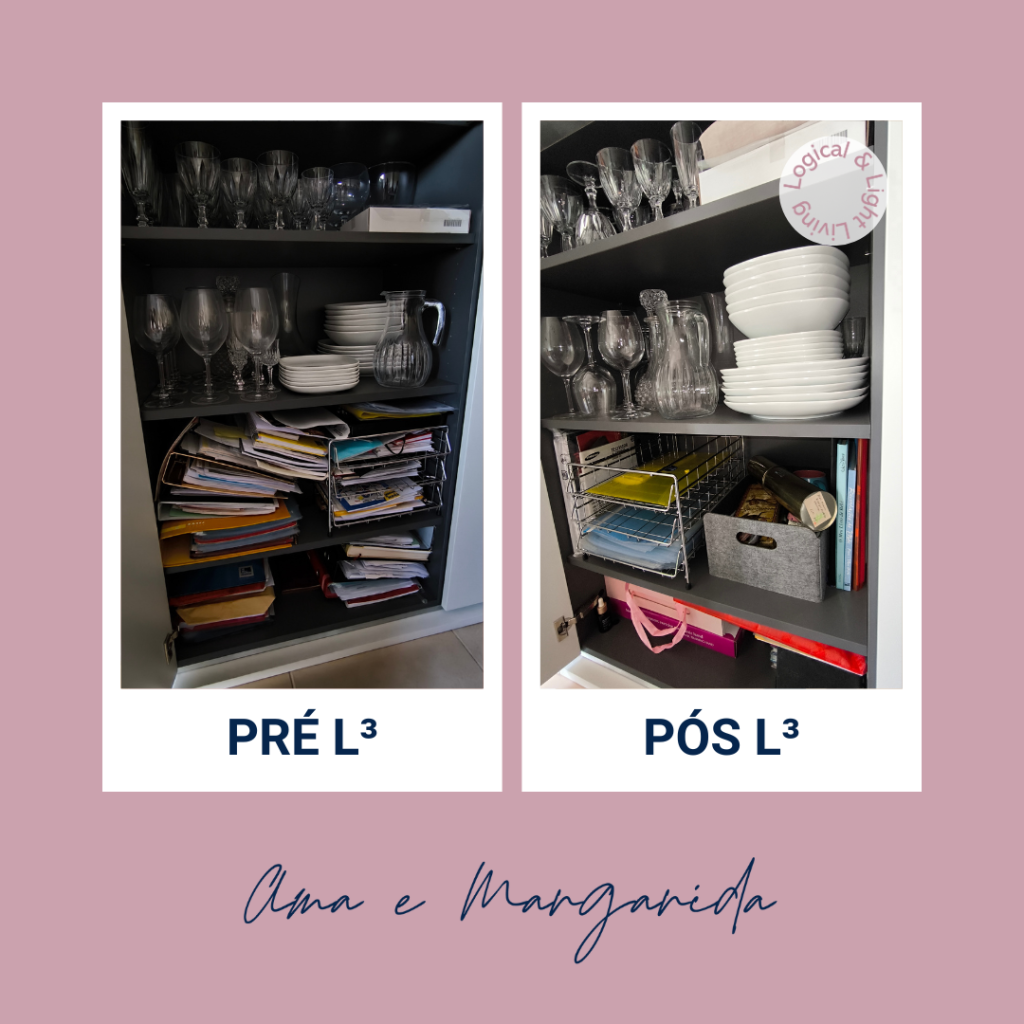 Como em todos os projectos começou-se por retirar tudo de dentro dos móveis. Nesse decorrer foram sendo criadas diversas categorias: documentos, fotografias, memórias, DVD’s, jogos de família, acessórios de escritório, livros. Esta categorização deu uma percepção real das quantidades existentes. Em seguida foi feita uma avaliação do que fazia ou não sentido manter. Esta acção liberta espaço físico mas também o faz na nossa mente. No processo deste destralhe houve memórias revisitadas, o que por vezes se tornou desafiante para a cliente. O passo seguinte foi identificar lugares específicos para cada categoria. O desafio adensou-se: nem sempre se acerta à primeira porque o espaço é estanque e nem todos os pertences têm a quantidade ou forma que se adequa ao espaço.