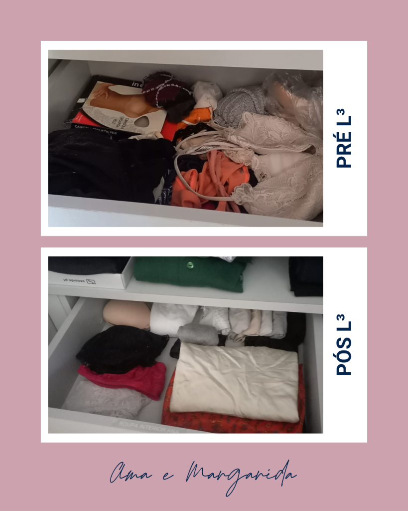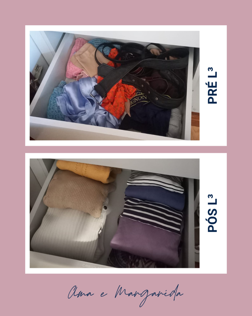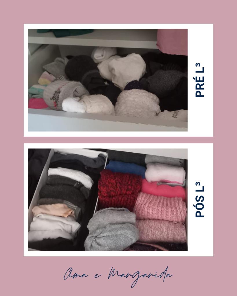 Encontrámos várias caixas que não estavam a uso ou que tinham uma função menos prática, e com pequenos ajustes, tornaram-se aliadas essenciais na organização do armário.